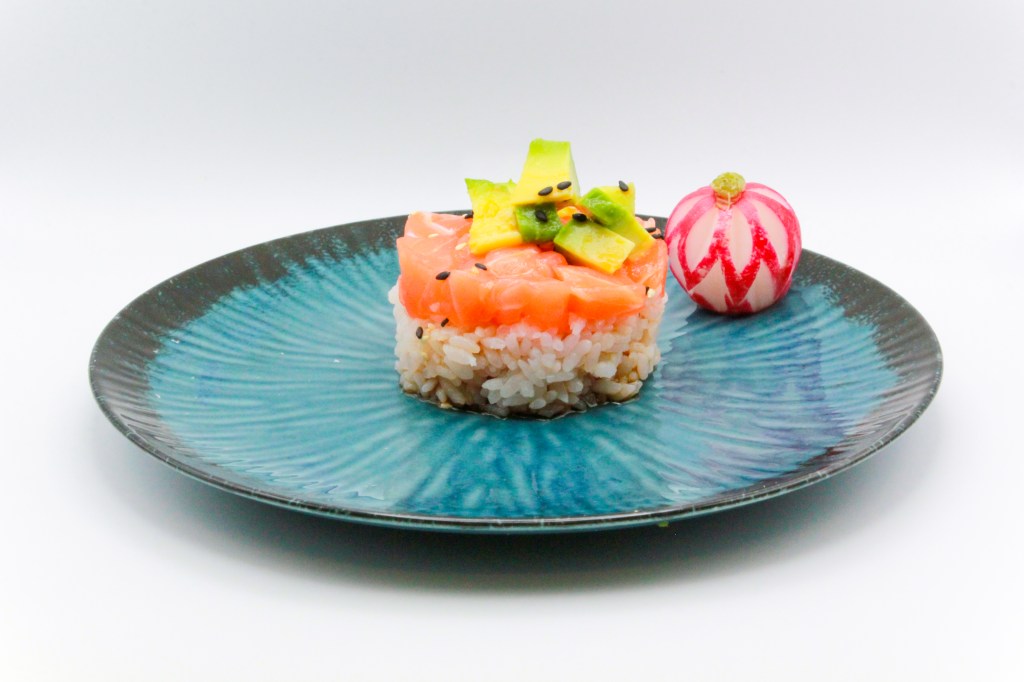 Sfoglia con tartar di salmone, purè di patate e tariyaki