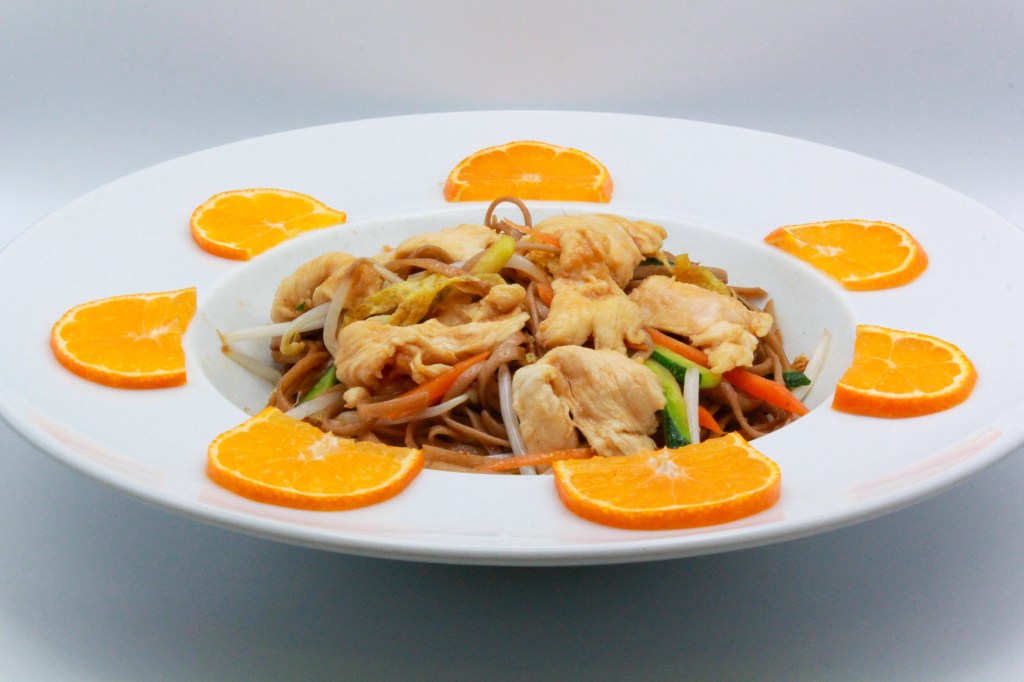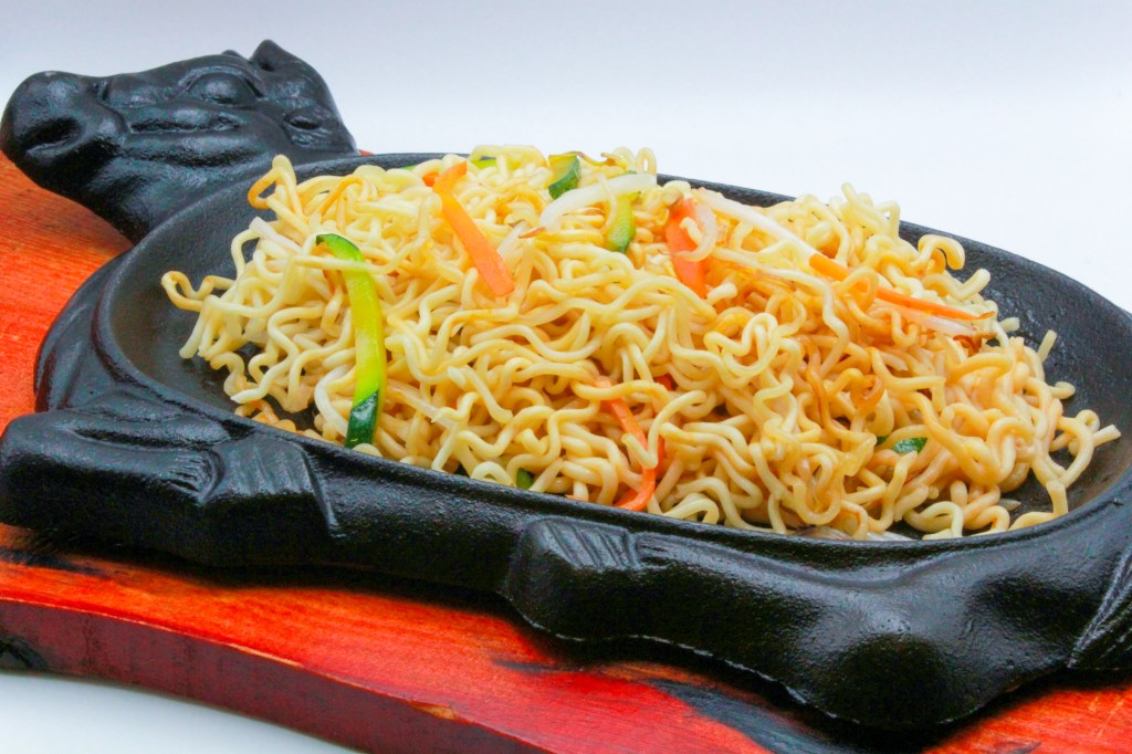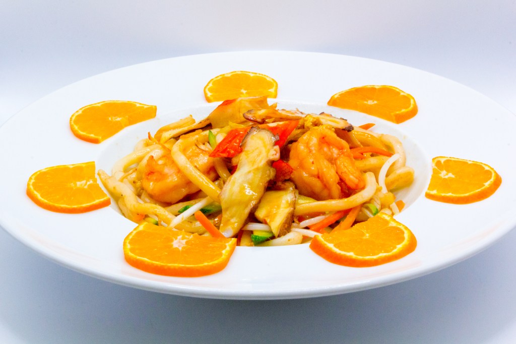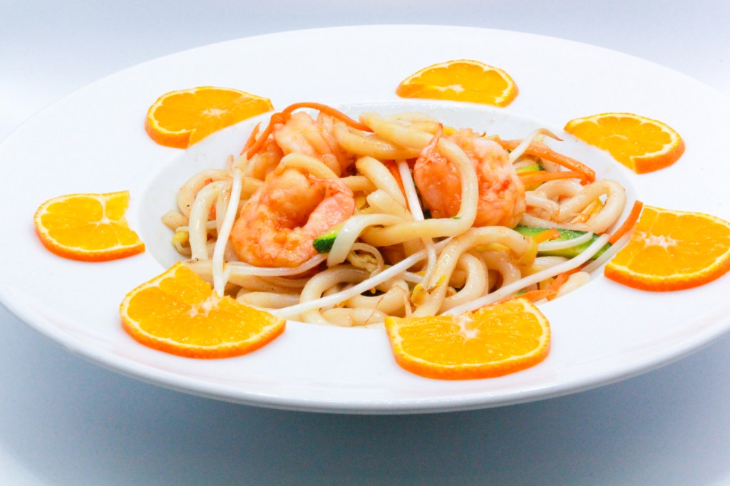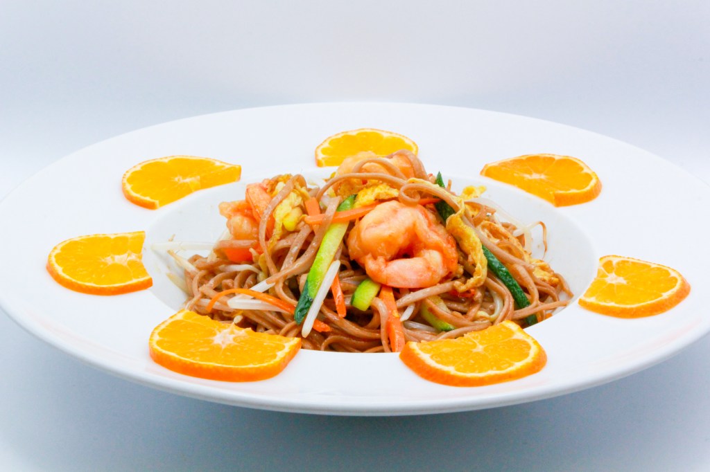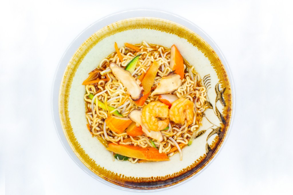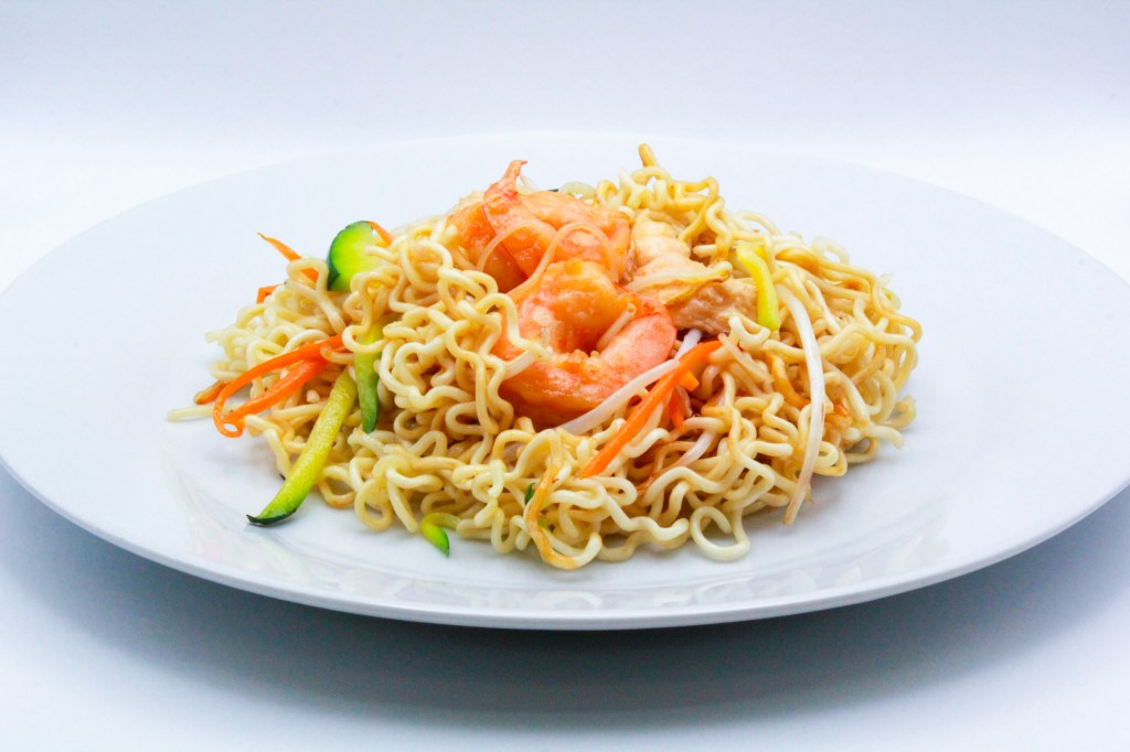 Ramen saltati con gambero, pollo, uova, verdure miste e salsa di soia