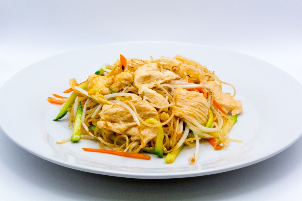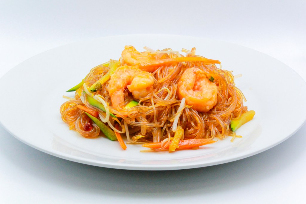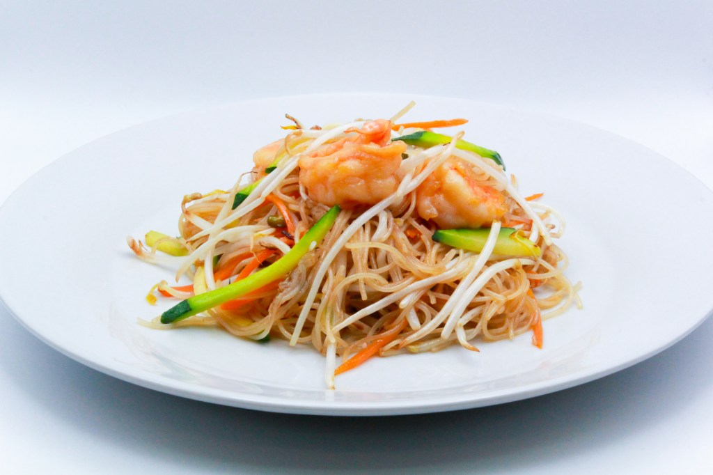 Spaghetti di riso con frutti di mare, uova, verdure miste, salsa di soia