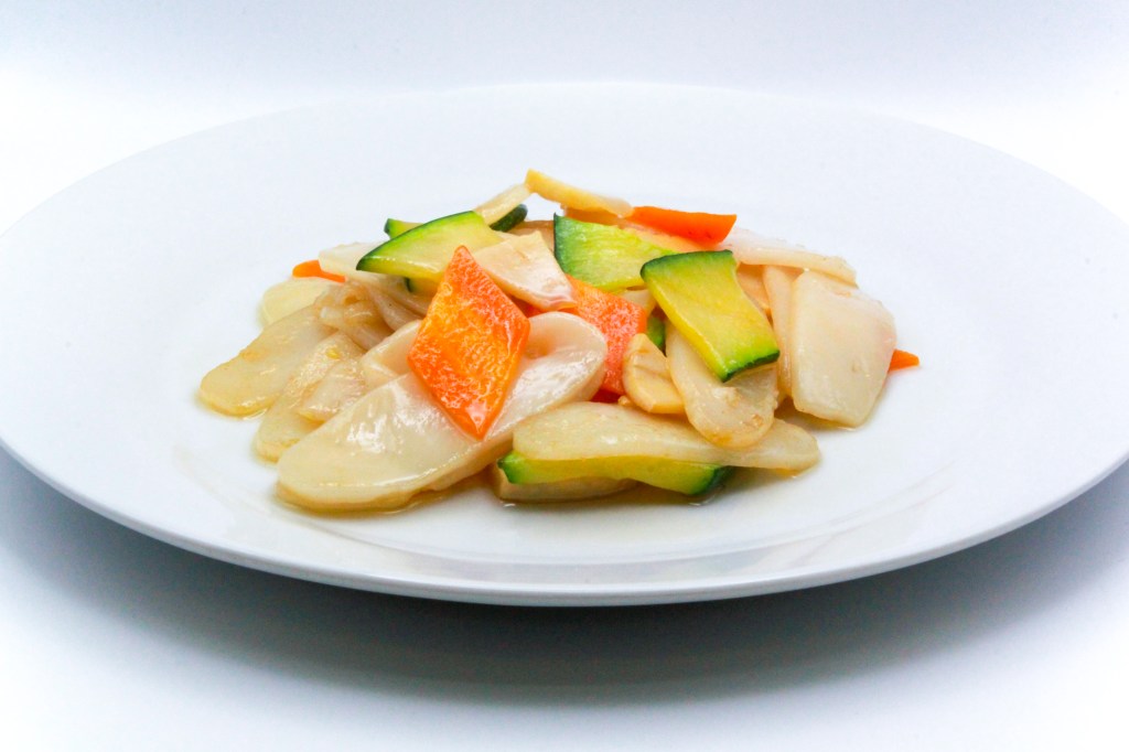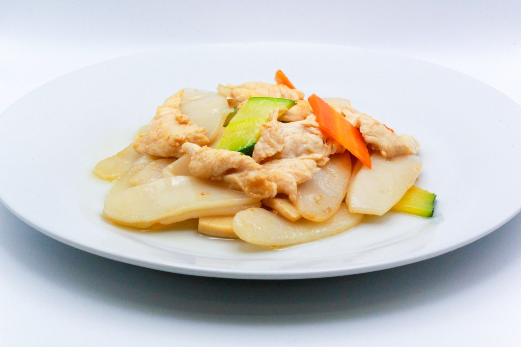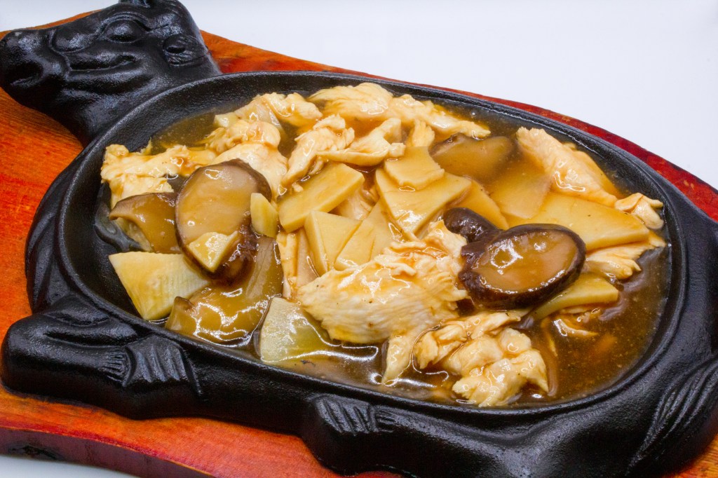 Pollo saltato con bambù, funghi e salsa di soia