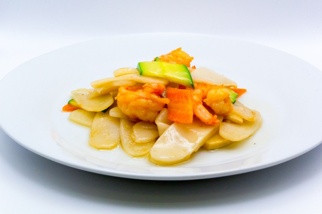 Gnocchi di riso con frutti di mare, verdure miste e salsa di soia