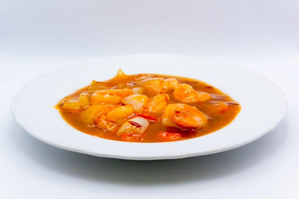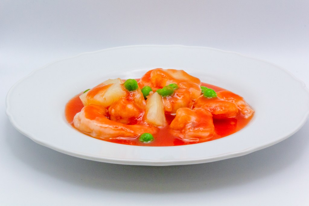 Gamberi saltati con piselli, ananas e salsa di agrodolce