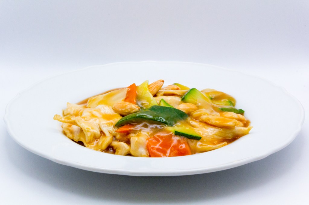 Pollo e mandorle saltato con verdure miste e salsa di soia