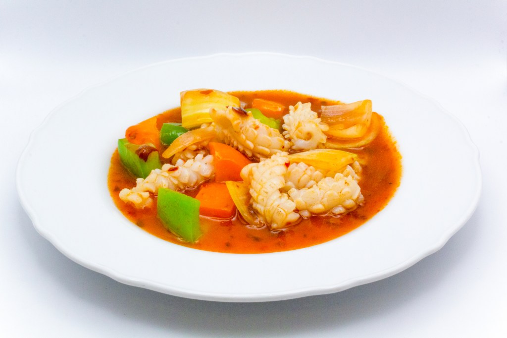 Calamari saltati con peperone, cipolla, salsa piccante