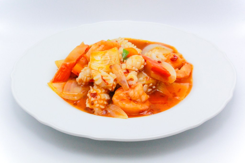 Calamari, gamberi, grancchio, saltati con peperone, cipolla, salsa piccante
