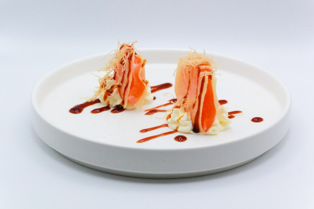 Sfoglie con salmone, philadelphia, teriyaki, olio di tartufo e kataifi
