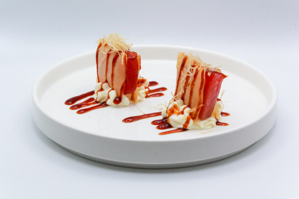 Sfoglie con tonno, philadelphia, olio di tartufo, teriyaki e kataifi