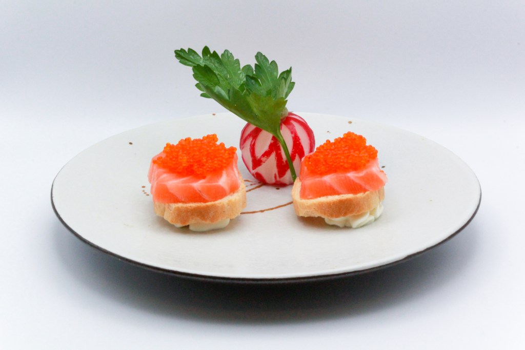 Fetta di pane croccante, philadelphia, salmone tobiko, olio di tartufo