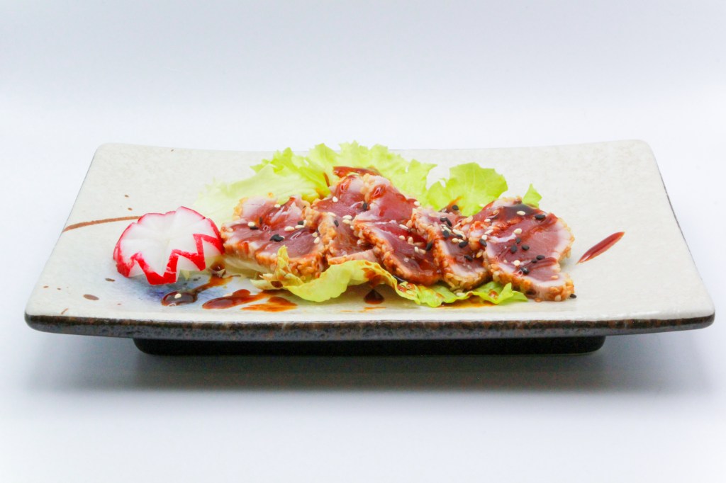 Sfoglia con tartar di tonno, purè di patate e teriyaki