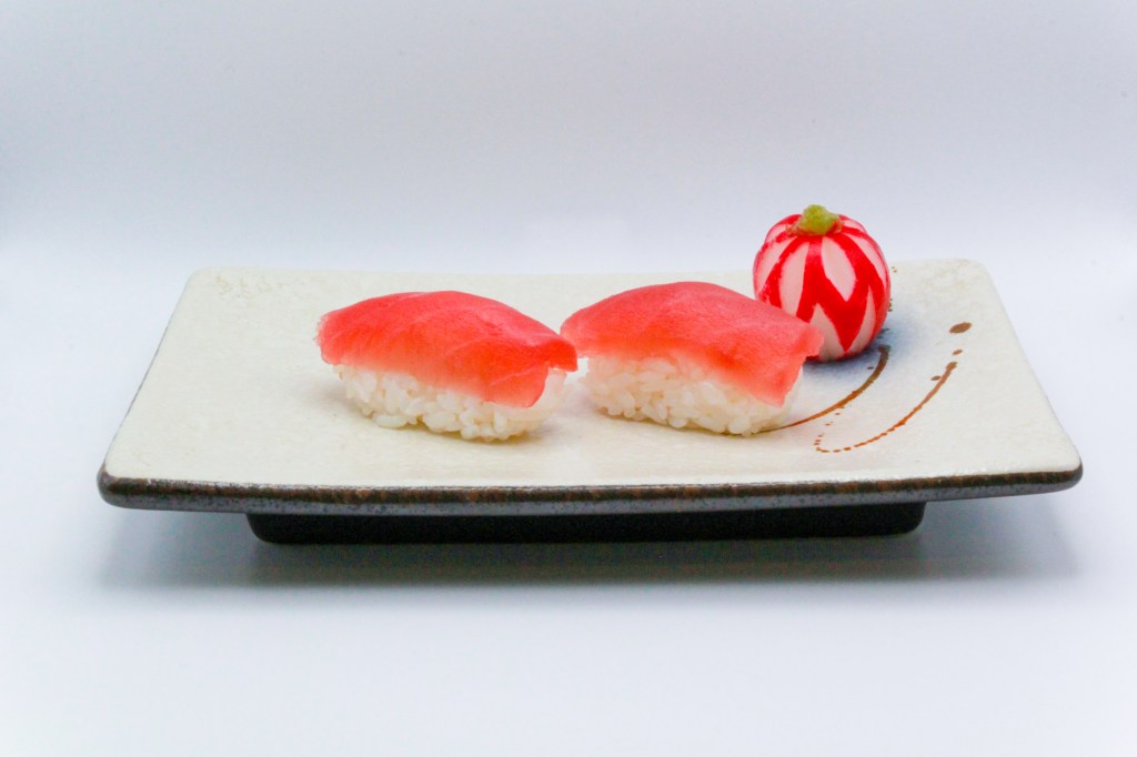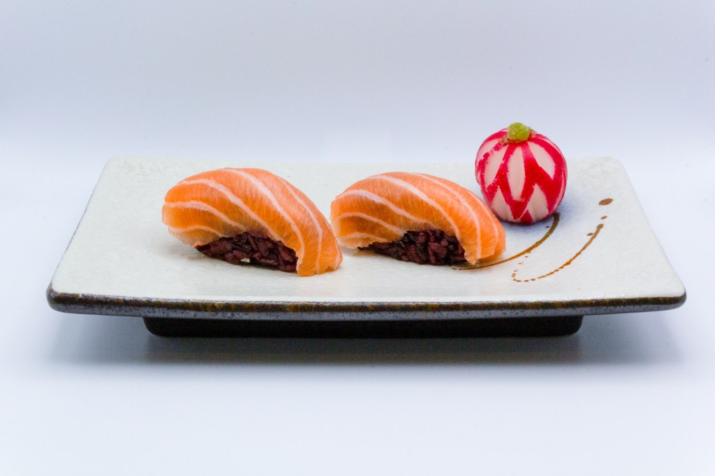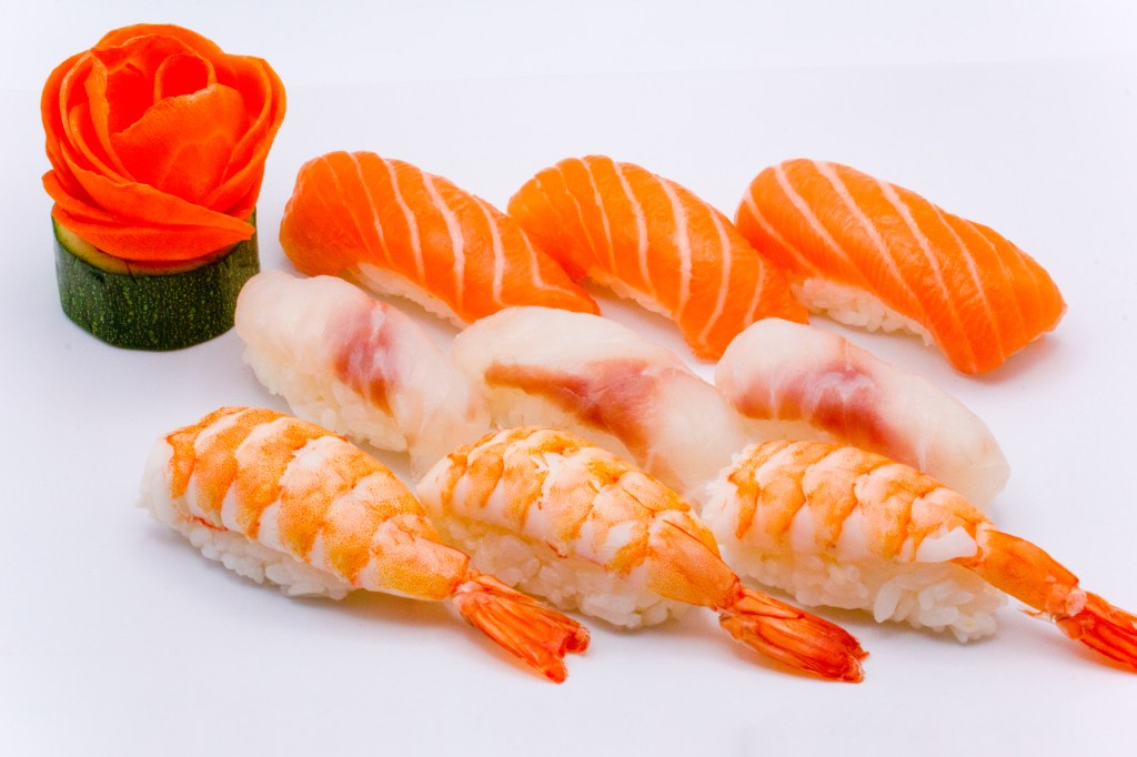 3pz nigiri salmone, 3pz nigiri branzino, 3pz nigiri gamberi (cotto)