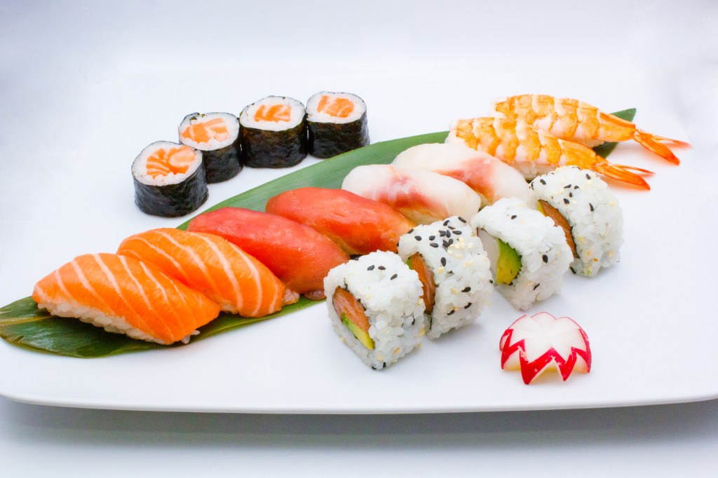 10 nigiri misto, 8pz hossomaki, 8pz uramaki, 8pz futomaki fritti, 2pz gunkan, 14pz sashimi misto
