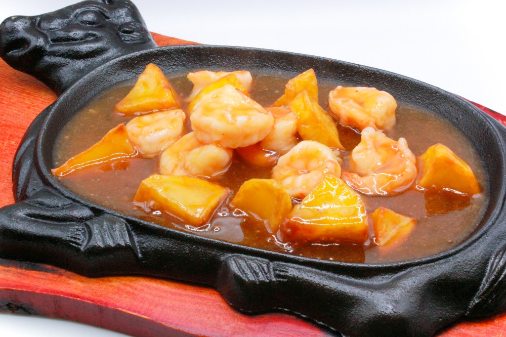 Gamberi saltati con peperone, cipolla, salsa piccante